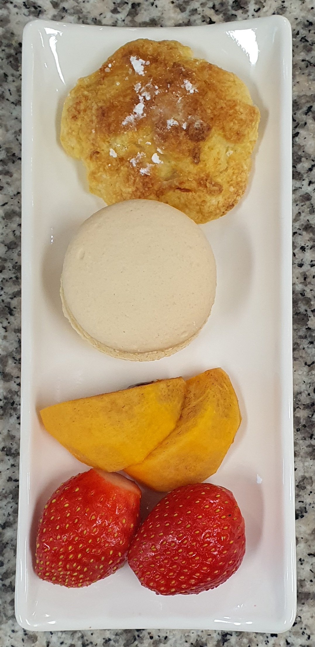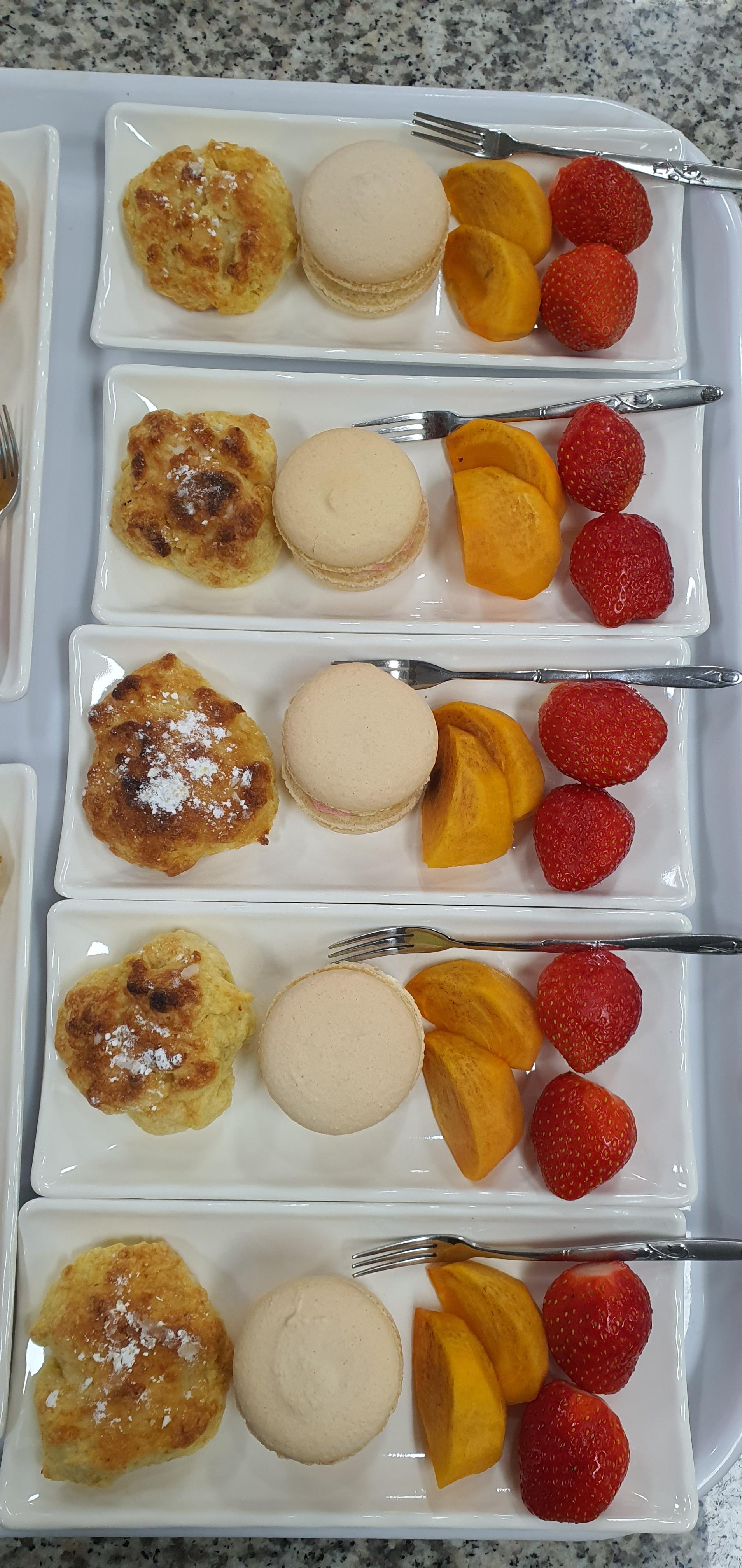 디저트 간식(콘빵, 마카롱, 감, 딸기)